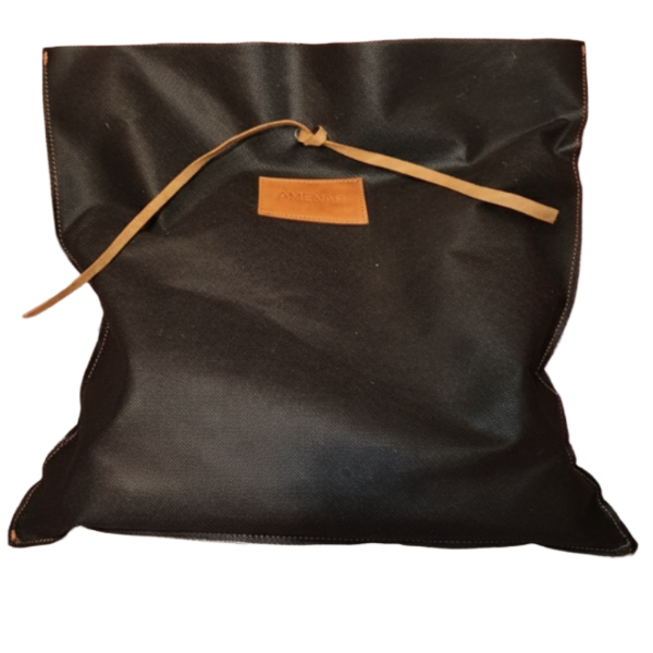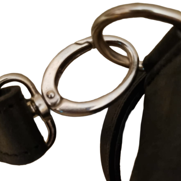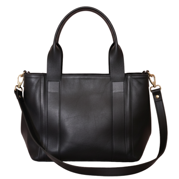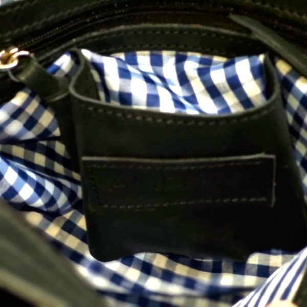 Cartera de cuero negro con manijas, correa bandolera y elegantes herrajes plateados. Interior forrado con tela cuadriculada blanca y negra, amplio bolsillo con cierre y bolsillo porta celular de cuero de fácil acceso. 20 x 35 cm. Provista con una práctica bolsa de friselina negra para protegerla durante el guardado y traslados